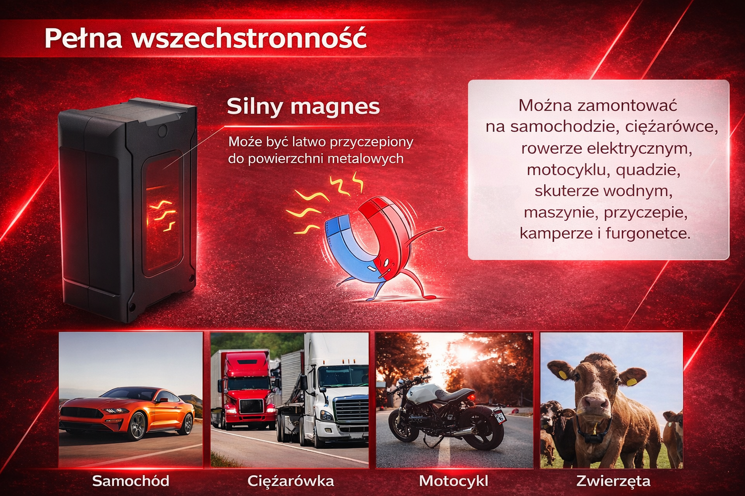 Urządzenie ma silny magnes, dzięki czemu można zamontować je pod autem, w bagażniku, przy ramie motocykla, w plecaku, walizce, a nawet przy obroży zwierzęcia. Jest kompaktowe i łatwe do ukrycia. 🧲🚗